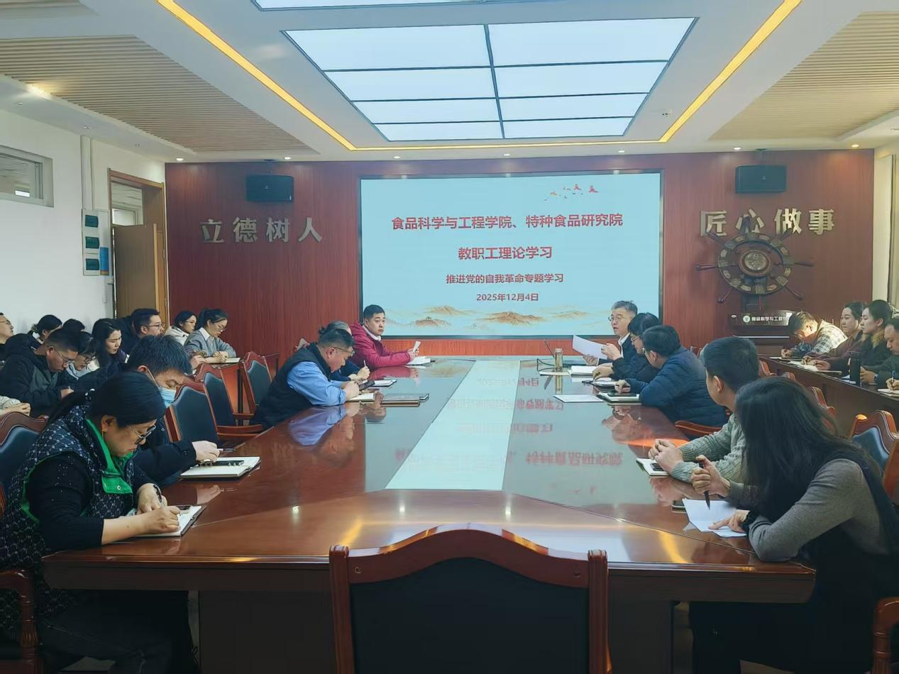 12月4日,70net永乐高、特种食品研究院召开全体教职工理论学习会议,围绕推进党的自我革命进行专题学习,会议由学院党委书记车广杰主持,全体教职工参加。