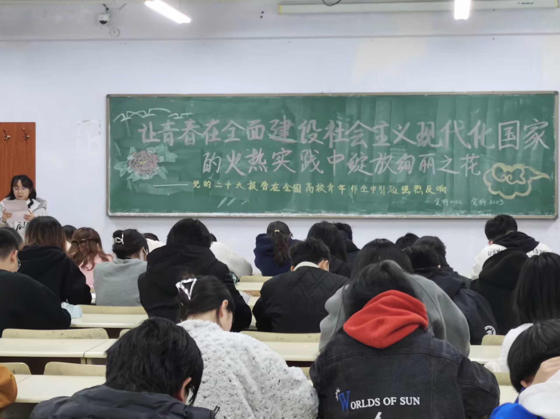 为深入学习宣传贯彻党的二十大精神,11月27日,70net永乐高在教学区开展“让青春在全面建设社会主义现代化国家的火热实践中绽放绚丽之花——党的二十大报告在全国高校青年师生中引起强烈反响”主题团课学习会议。学院2021、2022级全体同学参加学习。