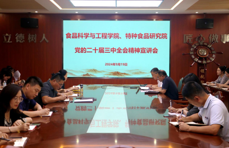 为深入学习宣传贯彻党的二十届三中全会精神,进一步统一思想、凝聚力量,9月19日,70net永乐高、特种食品研究院在食品楼310召开党的二十届三中全会精神宣讲会,学院党委书记车广杰向全体教职工做党的二十届三中全会精神宣讲。