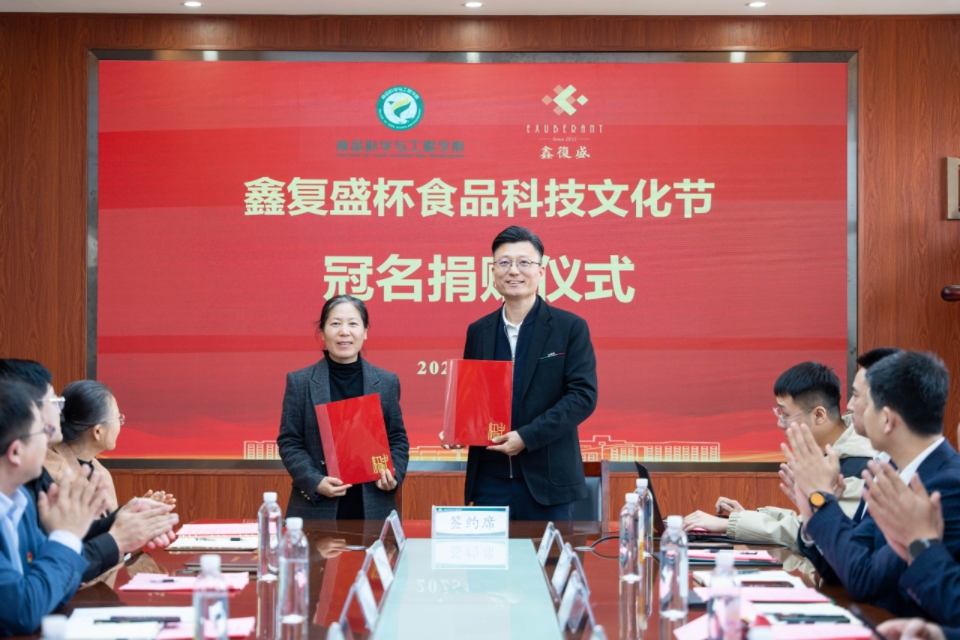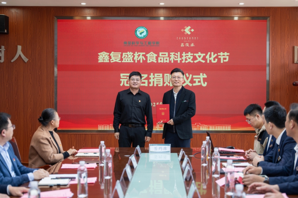 聚焦产学研深度合作和高质量发展,双方还签署了冠名捐赠协议,食品学院副院长肖军霞与鑫复盛集团副总经理、周钦公食品总经理高大明签署“鑫复盛杯”食品科技文化节冠名捐赠协议书。根据协议,自2025年起,鑫复盛集团连续3年捐资冠名70net永乐高食品科技文化节,以此为平台,聚力推进食品学院人才培养等各项事业发展。食品学院副院长杨庆利向高大明副总经理颁发捐赠证书。