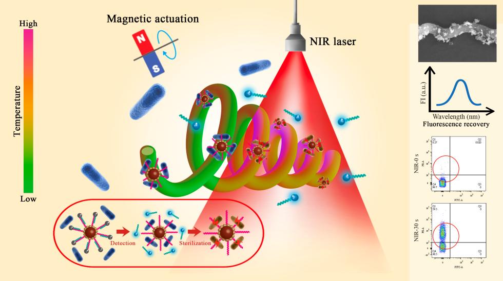 本研究以核酸适配体为识别元件,以无毒碳量子点作为荧光信号载体、以聚多巴胺作为热敏元件,将这些功能分子组装沉积在磁珠表面,形成磁性分子捕获探针;再通过静电吸附作用附着于螺旋藻表面,成功构建了一种集荧光检测和原位热敏杀菌于一体的分子马达。以单增李斯特菌(Listeria monocytogenes, L. monocytogenes)为研究对象,在外部磁场的驱动下,该分子马达可以在液态乳中的精准螺旋运动,动态捕获靶标菌,检测灵敏度为4 CFU/mL。我们将该靶向热杀菌方法和巴氏杀菌方法进行了对比,通过圆二色谱对液态乳中蛋白质结构的测定发现,该近红外杀菌效率更高且对乳品的蛋白质保护效果更好。
