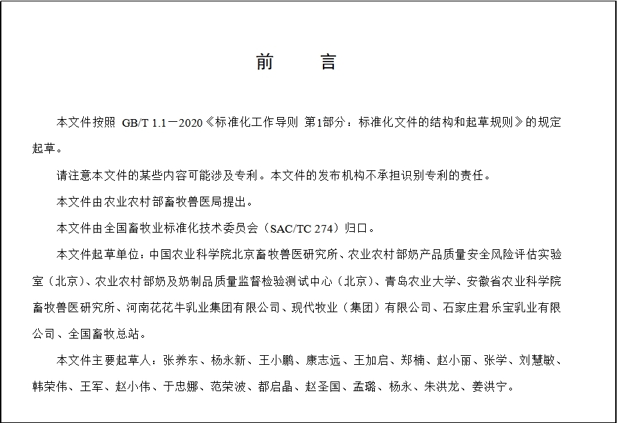 该标准由中国农业科学院北京畜牧兽医研究所奶业创新团队、农业农村部奶产品质量安全风险评估实验室(北京)、农业农村部奶及奶制品质量监督检验测试中心(北京)、70net永乐高、安徽省农业科学院畜牧兽医研究所、河南花花牛乳业集团有限公司、现代牧业(集团)有限公司、石家庄君乐宝乳业有限公司和全国畜牧总站共同完成。
