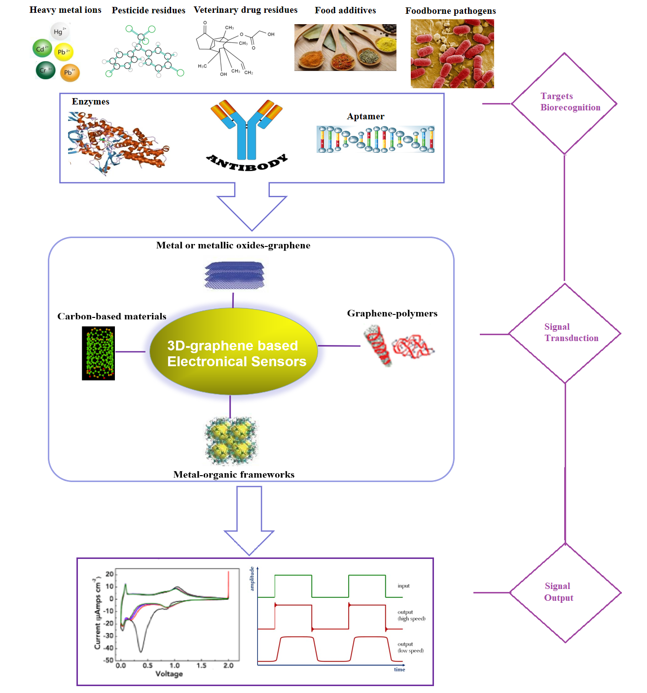 食品安全关乎人类健康,一直以来是研究人员密切关注热点。在食物加工的每个阶段(种植、加工、包装、运输和贮藏等),易受到不同有害物的污染,因此建立对食品中这些有害污染物快速、灵敏、高效、系统的检测分析方法是保障食品安全最有效的途径。三维石墨烯因其互联有序的框架结构,具有巨大的表面积、较高的电导率和电荷迁移率,被广泛应用于传感器、超级电容器等领域。在实际应用中,三维石墨烯传感器对某些食品污染物有良好的响应,但存在检测灵敏度较差、动态响应时间长、重复性差、选择性差等缺点,因此研究人员将金属纳米颗粒、金属氧化物、金属有机框架材料、碳基材料等纳米材料引入其中对其进行改性。