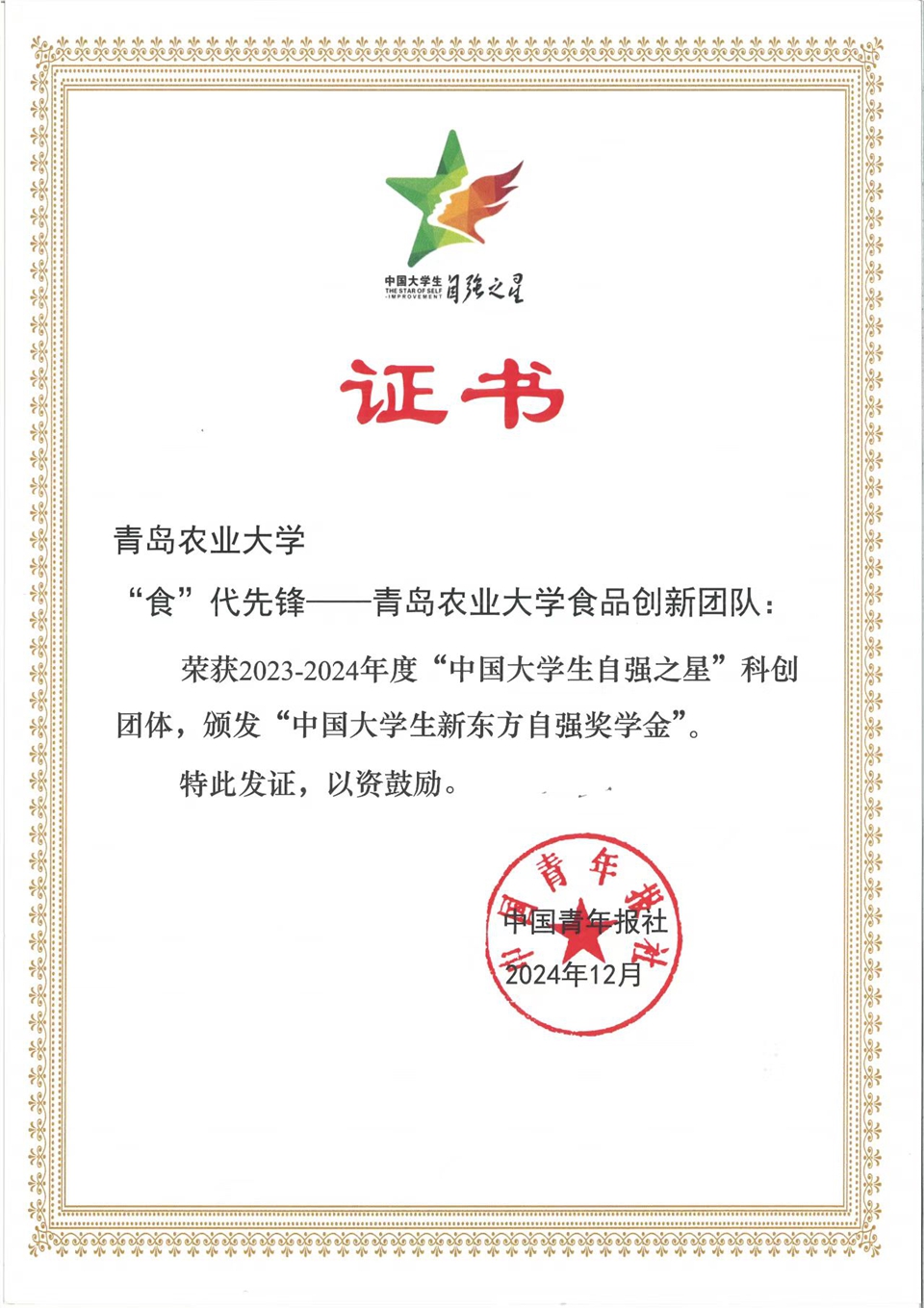 近日,2023—2024年度“中国大学生自强之星”奖学金评选结果揭晓,70net永乐高“食”代先锋大学生食品创新团队榜上有名,获评2023-2024年度“中国大学生自强之星”科创团体、“中国大学生新东方自强奖学金”,全国共有100个大学生创新团队获此殊荣。