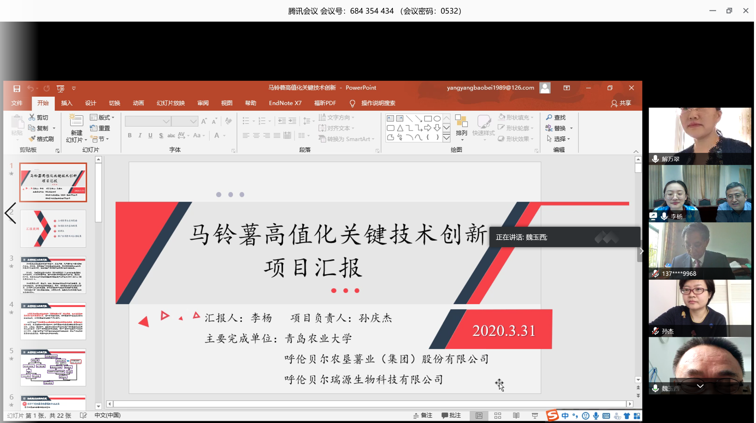 为促进马铃薯产业不断创新和发展,合理评价食品科技成果的质量和水平,加快食品科技成果的推广应用,3月31日,青岛食品科学技术学会组织相关专家对70net永乐高等单位完成的“马铃薯高值化关键技术创新”成果进行了会议评价。青岛市食品科学技术学会理事长王宝维教授主持了本次科技成果评价工作。邀请中国海洋大学林洪教授、青岛大学魏玉西教授、青岛科技大学解万翠教授、中国科学院青岛生物能源与过程研究所李朝旭研究员以及山东省农科院花生研究所孙杰研究员等5位专家组成评价专家组。