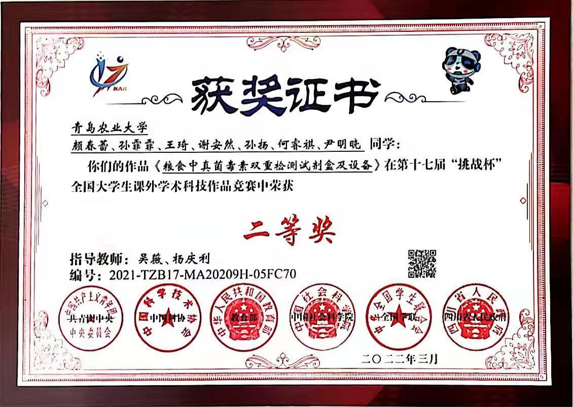 “挑战杯”获奖项目:《粮食中真菌毒素双重检测试剂盒及设备》