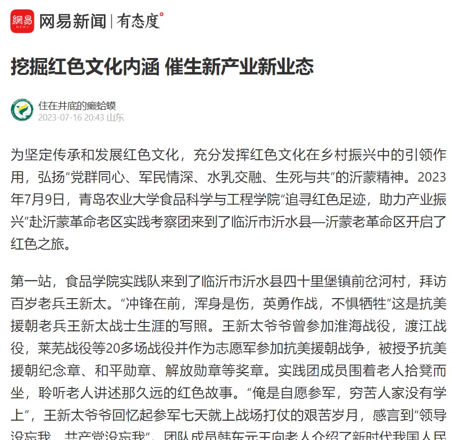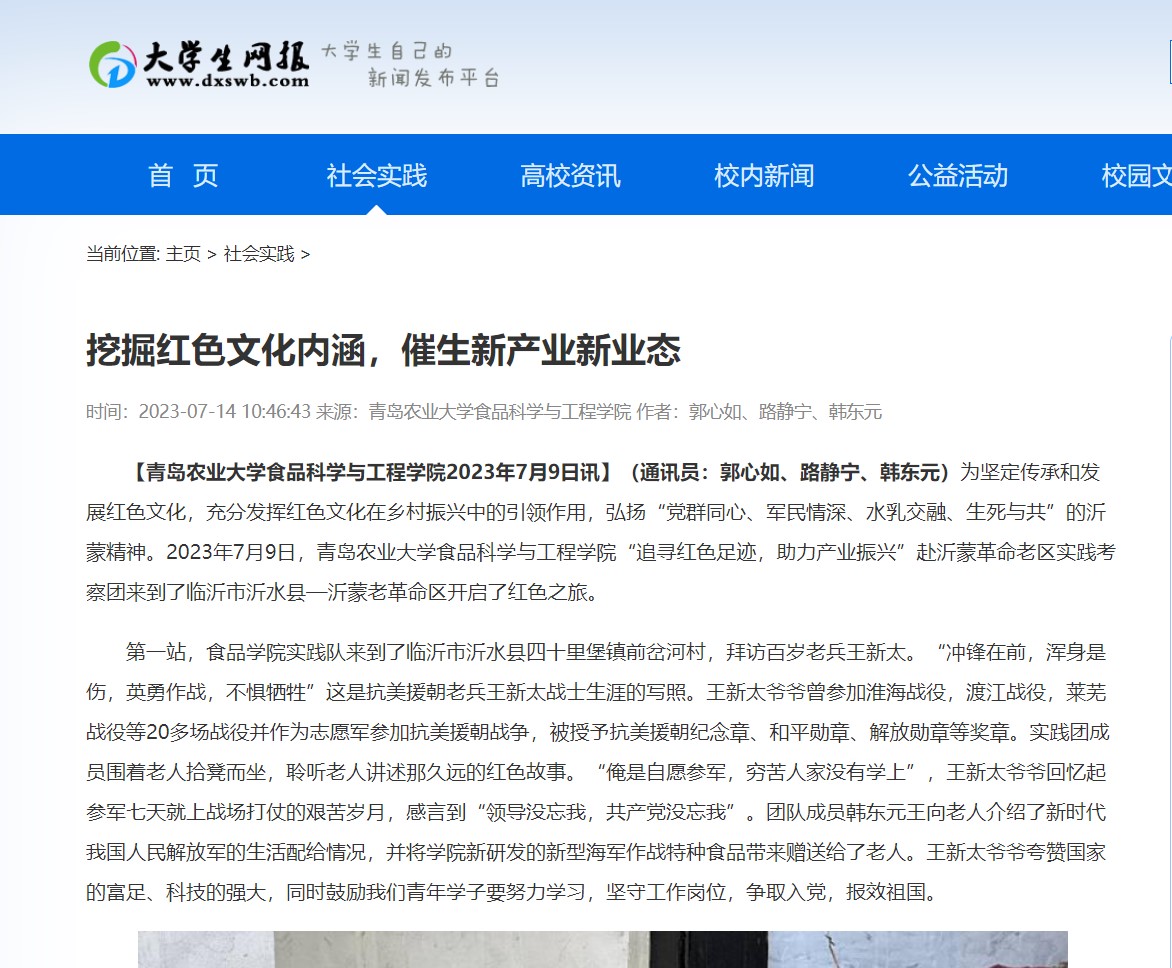 【今日大学生网】为关注食品企业产业振兴,鼓励食品学生学以致用,7月7日下午,70net永乐高“追寻红色足迹,助力产业振兴”赴沂蒙革命老区实践考察团,沿着总书记的足迹,在指导老师耿磊的带领下,走进科技小院开展社会实践活动。