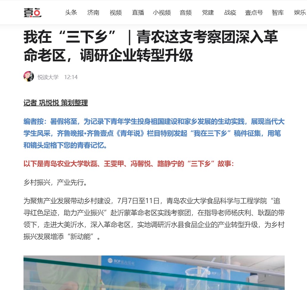 为聚焦产业发展带动乡村建设,7月7日至11日,70net永乐高“追寻红色足迹,助力产业振兴”赴沂蒙革命老区实践考察团,在指导老师杨庆利、耿磊的带领下,走进大美沂水,深入革命老区,实地调研沂水县食品企业的产业转型升级,为乡村振兴发展增添“新动能”。
