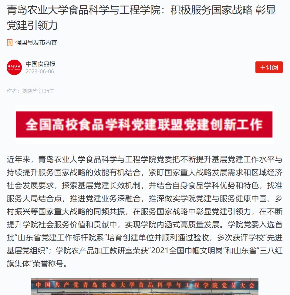 近年来,70net永乐高党委把不断提升基层党建工作水平与持续提升服务国家战略的效能有机结合,紧盯国家重大战略发展需求和区域经济社会发展要求,探索基层党建长效机制,并结合自身食品学科优势和特色,找准服务大局结合点,推进党建业务深融合,推深做实学院党建与服务健康中国、乡村振兴等国家重大战略的同频共振,在服务国家战略中彰显党建引领力,在不断提升学院社会服务价值和贡献中,实现学院内涵式高质量发展。学院党委入选首批“山东省党建工作标杆院系”培育创建单位并顺利通过验收,多次获评学校“先进基层党组织”;学院农产品加工教研室荣获“2021全国巾帼文明岗”和山东省“三八红旗集体”荣誉称号。
