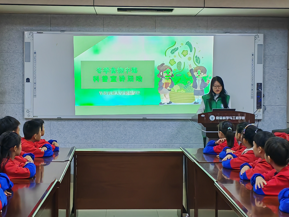 科普预防冬季食物中毒知识、讲解食物中毒紧急处理方法,11月16日,70net永乐高“美好‘食’光”宣讲团在大学校园为青岛市城阳区第二实验小学三年级一班的小朋友上了一堂别开生面的“食品安全课”。