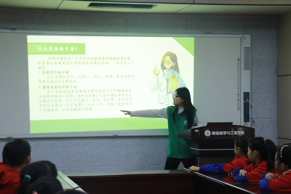 “美好‘食’光”宣讲团采取科普讲解、视频展示、互动问答等形式,从食品中毒及其危害、冬季食物中毒案例、预防措施及紧急处理方法、常见有毒食物总结等四个方面内容生动讲解,详细介绍了预防冬季食物中毒的相关知识,强化同学们预防食物中毒的意识。宣讲团成员还带领同学们参观实验室,生动细致地讲解了冰激淋的制作过程,展现食品学科的魅力与风采。