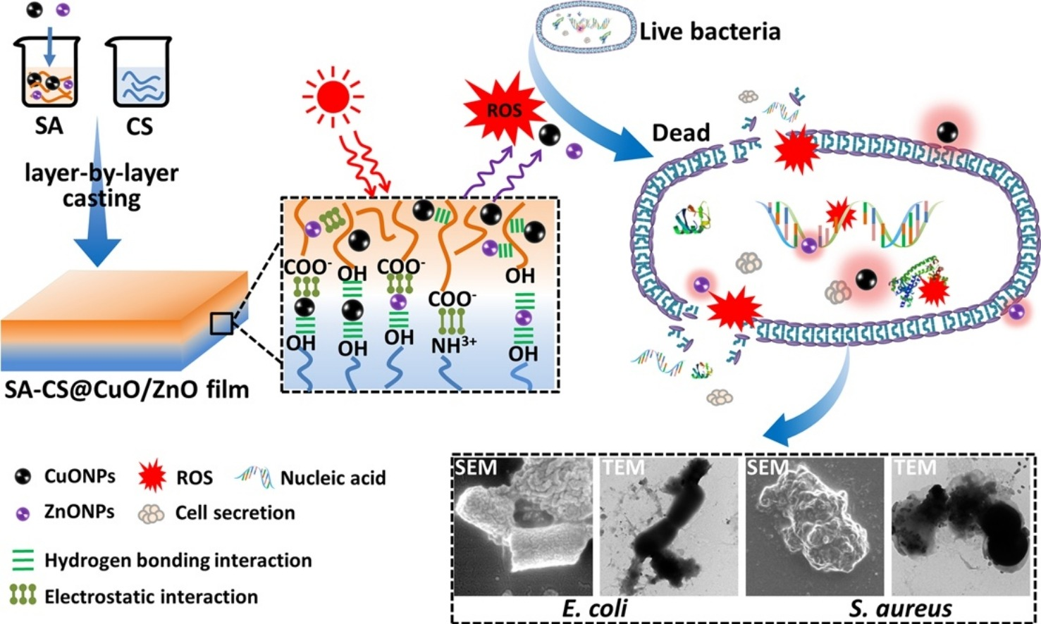 在该文章中,作者基于纳米CuO和ZnO制备了海藻酸钠/壳聚糖-纳米金属氧化物复合膜,在光照下可产生活性氧自由基,并且在土中28天可分解,具有良好的光催化活性和生物可降解性。进一步,作者发现光照下该膜对大肠杆菌(E. coli)和金黄色葡萄球菌(S. aureus)的生长抑制率超过90%。该膜可激活两种细菌的膜转运系统、抗氧化防御系统、细胞膜和DNA修复系统,但是,当膜对细菌细胞损伤超过细胞的防御和动态调节能力时,将破坏细菌细胞壁和细胞膜完整性,导致胞内氧化还原稳态失衡,细菌发生死亡。