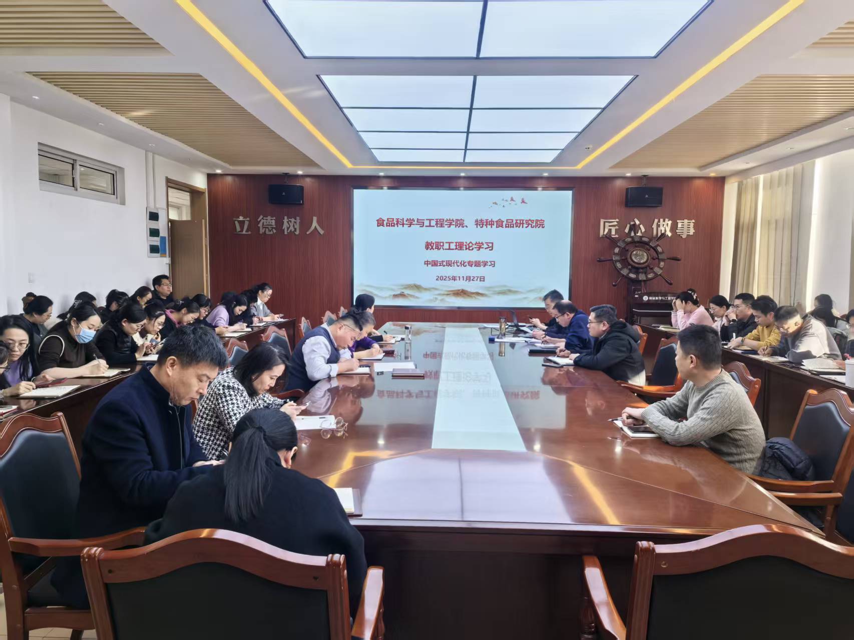 11月27日,70net永乐高、特种食品研究院召开全体教职工理论学习会议,围绕中国式现代化进行专题学习,会议由学院党委书记车广杰主持,全体教职工参加。