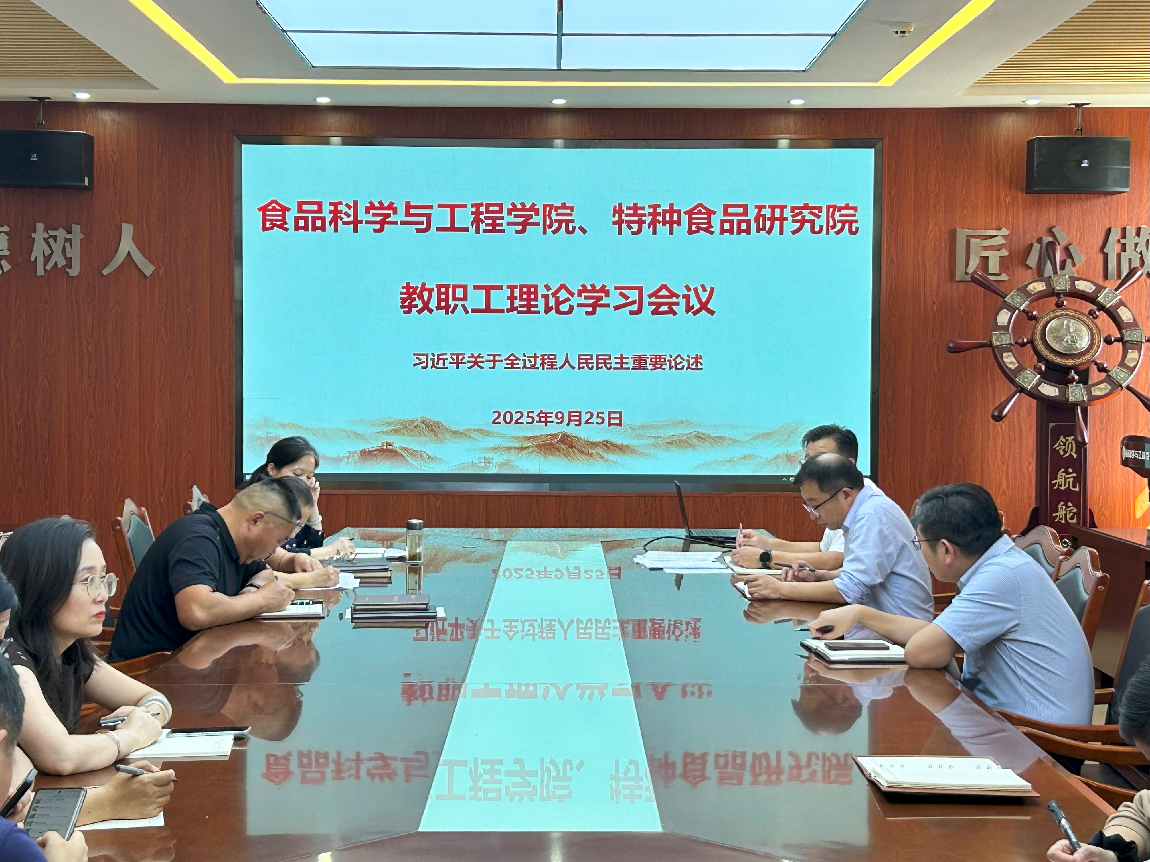 9月25日,70net永乐高、特种食品研究院召开教职工理论学习会议,集体学习习近平总书记关于全过程人民民主的重要论述。会议由学院党委书记车广杰主持,全体教职工参加。