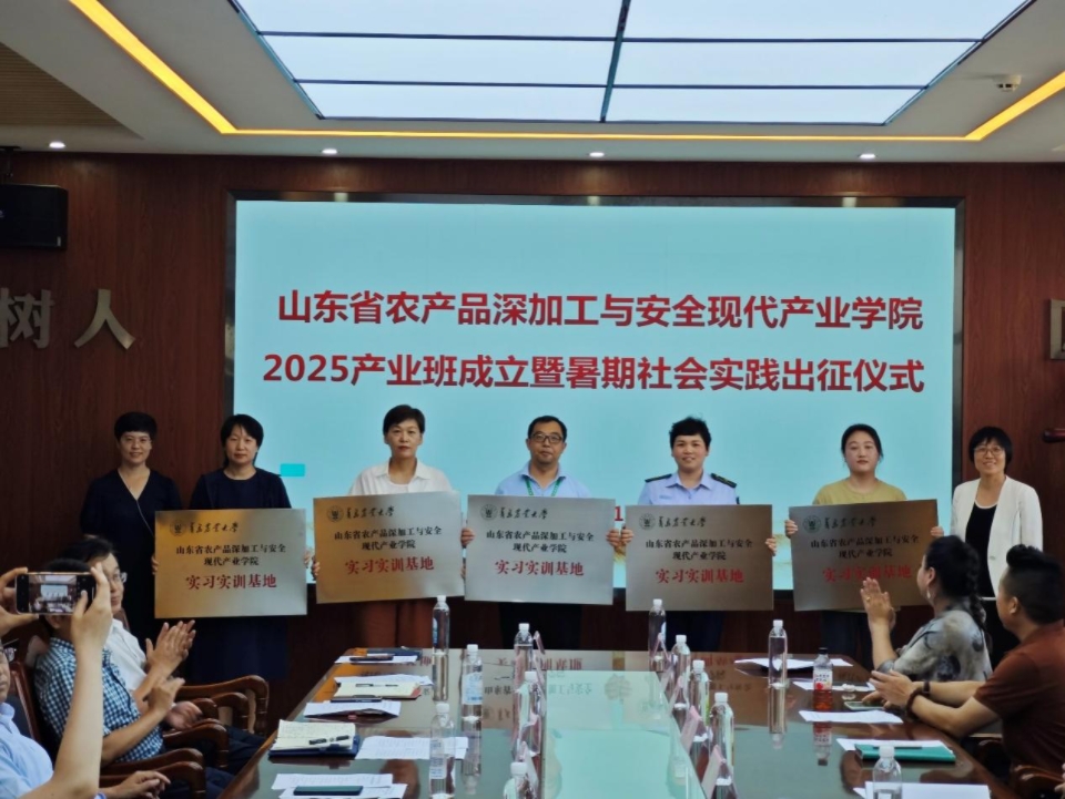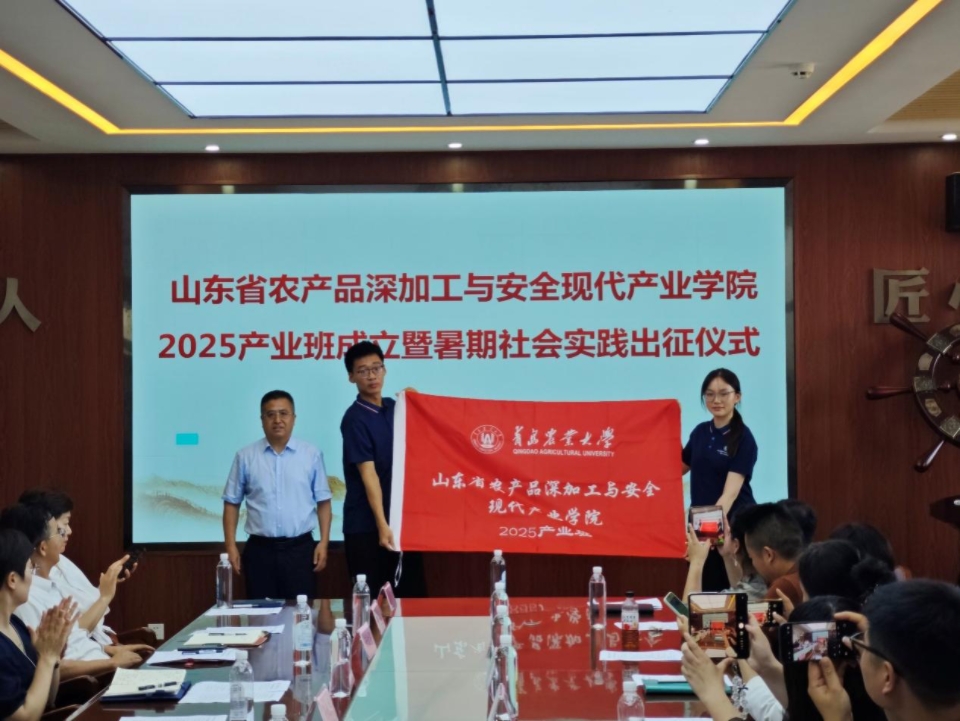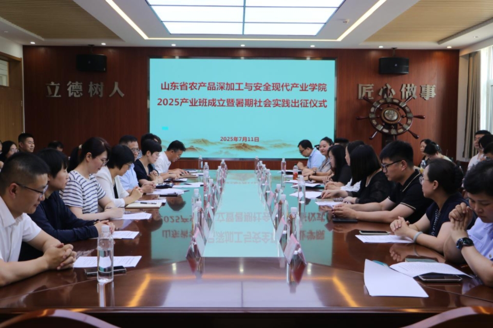7月11日,山东省农产品深加工与安全现代产业学院2025产业班成立暨暑期实践出征仪式在食品楼举行。青岛市城阳区食品饮料产业协会秘书长黄柳以及青岛鑫复盛等14家企业负责人参加活动,学校党委委员、副校长孙庆杰出席仪式并讲话,学生工作处处长许颖、社会合作处副处长于宁、校团委副书记安金鹏以及教务处、70net永乐高等单位有关负责人参加仪式。仪式由70net永乐高党委书记车广杰主持。