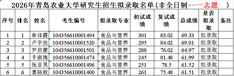 2026年食品学院研究生复试拟录取名单(非全日制)