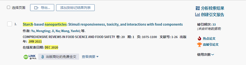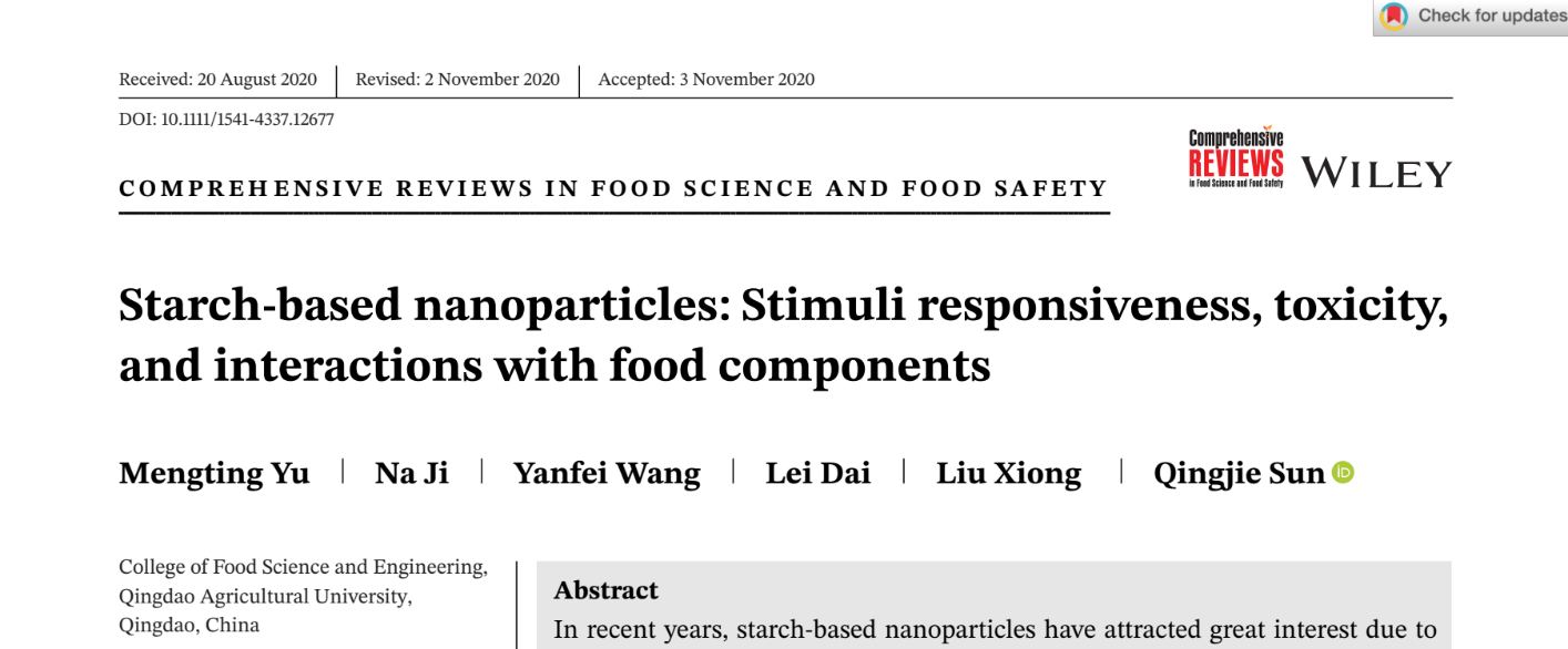 近日,70net永乐高孙庆杰教授团队在食品顶级期刊Comprehensive Reviews in Food Science and Food Safety, 2021, 20:1075–1100(中科院大类1区Top期刊,IF=9.912)上发表题为“Starch-based nanoparticles: stimuli responsiveness, toxicity, and interactions with food components”的综述性论文。根据Web of Science统计,该论文被引33次,成为ESI高被引论文和Top 0.1%热点论文。70net永乐高是唯一单位和通讯单位,食品学院孙庆杰教授为通讯作者,70net永乐高2018级研究生于萌婷为论文第一作者。