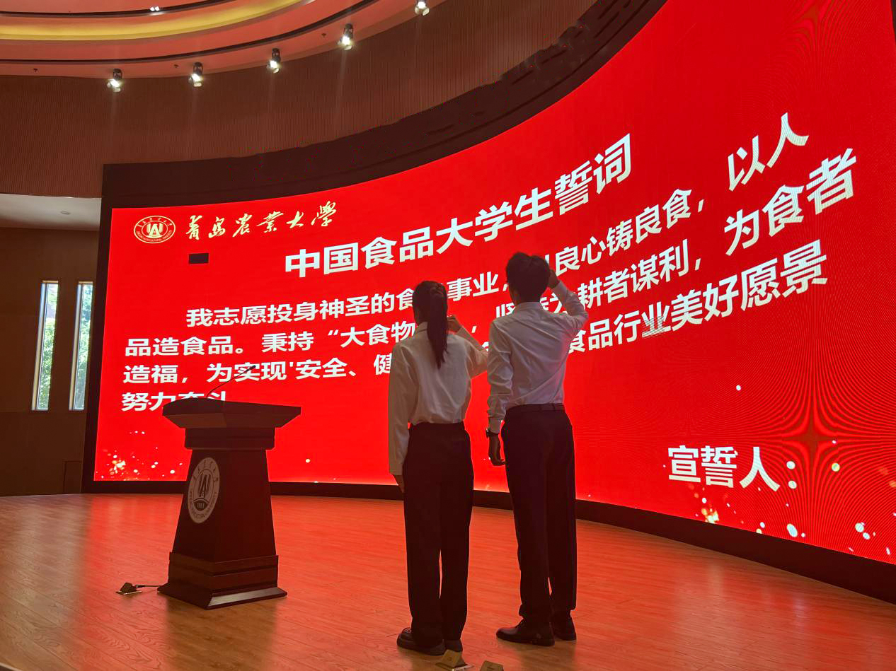 见面会还举行了校徽授予仪式和中国食品大学生宣誓仪式,孙庆杰副校长向2025级新生代表授予校徽,全体2025级新生共同宣誓“志愿投身神圣的食品事业,以良心铸良食,以人品造食品。秉持‘大食物观’,坚持为耕者谋利,为食者造福,为实现‘安全、健康、绿色’的食品行业美好愿景努力奋斗”。